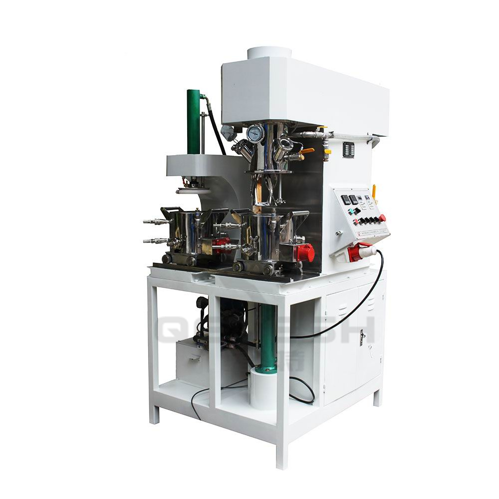 双行星动力混合机是一种新型且对多种混合液体、粉体进行搅拌、溶解、分散、均质的搅拌设备。该设备配有高速、低速、活动刮板部件,低速搅拌部件采用行星齿轮传动,搅拌桨在公转时也自转,使物料上下及四周运动,从而在较短的时间内达到理想的混合效果。高速分散/乳化部件与行星箱一起公转,同时高速自转,使物料受到强烈的剪切与分散混合,罐体内壁为大型立车精加工,再经大型抛光机自动抛光,确保行星箱上的活动刮刀在旋转时,把罐体内壁上的物料完全刮掉,其混合效果是普通混合机的几到几十倍。广泛应用于电池、有机硅胶、高端油墨、染料、粘胶剂、高端高粘度涂料等化工产品的生产。