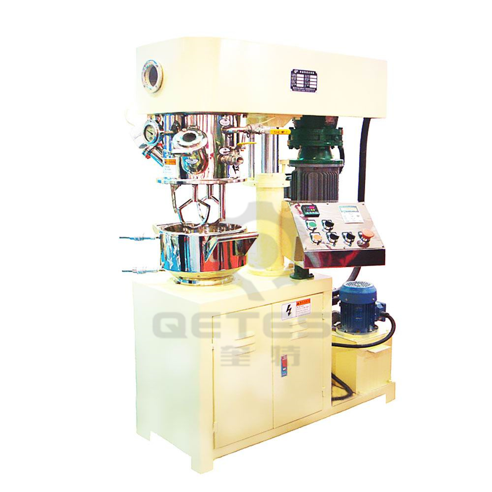 双行星混合机的搅拌桨叶,在公转的同时也自转,使罐体内物料上下及四周循环运动,从而可在很短时间内达到混合(混炼)效果。罐体内壁为大型立车精加工,再经大型抛光机自动抛光,确保行星箱上的活动刮刀在旋转时,把罐体内壁上的物料完全刮掉。该机特别适合从粉体到高黏度、高密度的物料溶解、混合、混炼、反应工艺。广泛应用于电池、有机硅胶、油墨、染料、粘胶剂、高粘度涂料等化工产品。