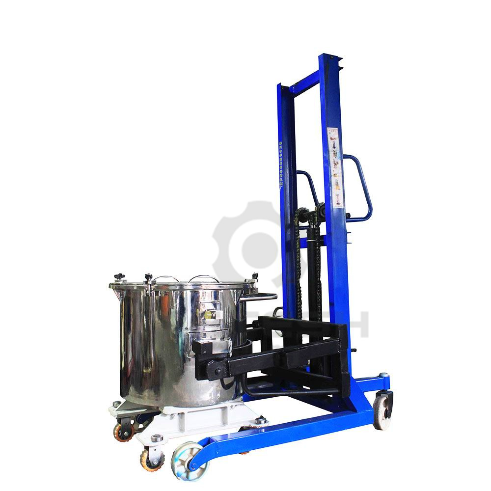 翻桶机放在支架底部平台上,固定装置连接牢靠,底部平台在油缸作用下上升。倾斜装置倾斜一定角度,料桶支架随之旋转达到位置后停止,物料倒出。 卸完料后,倾斜装置收缩,料桶支架旋转回到垂直位置,油缸复位,料桶支架下降到底位,料桶和支架分开。取出料桶,进行下一次操作。此产品配套搅拌机料缸使用,可升降和倾斜料桶。对于有特殊工艺,要求料桶及物料升降和倾斜出料的工况,特别适用,简易方便,性价比高。